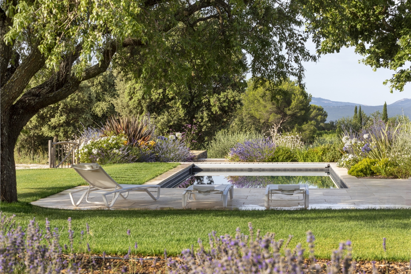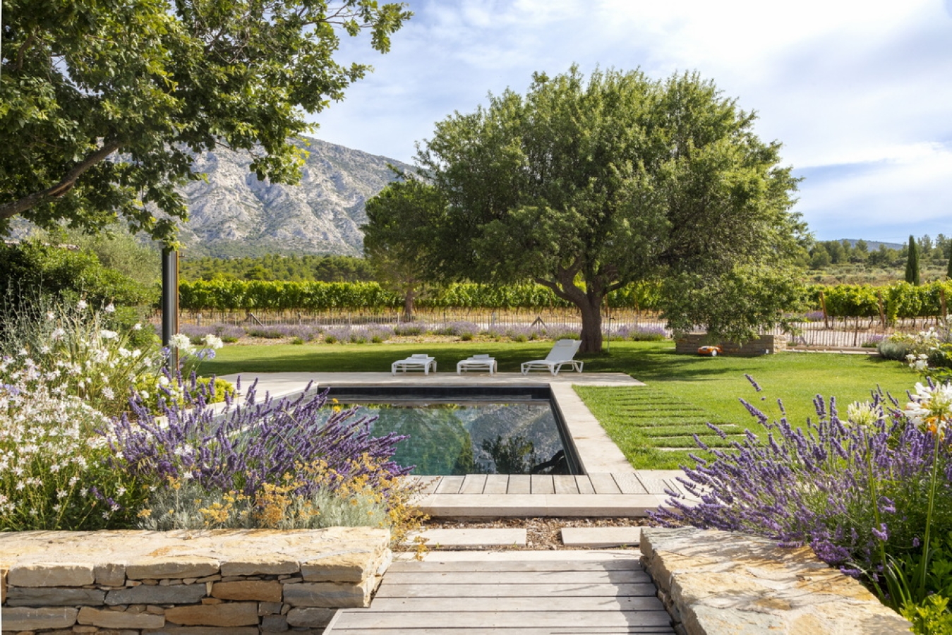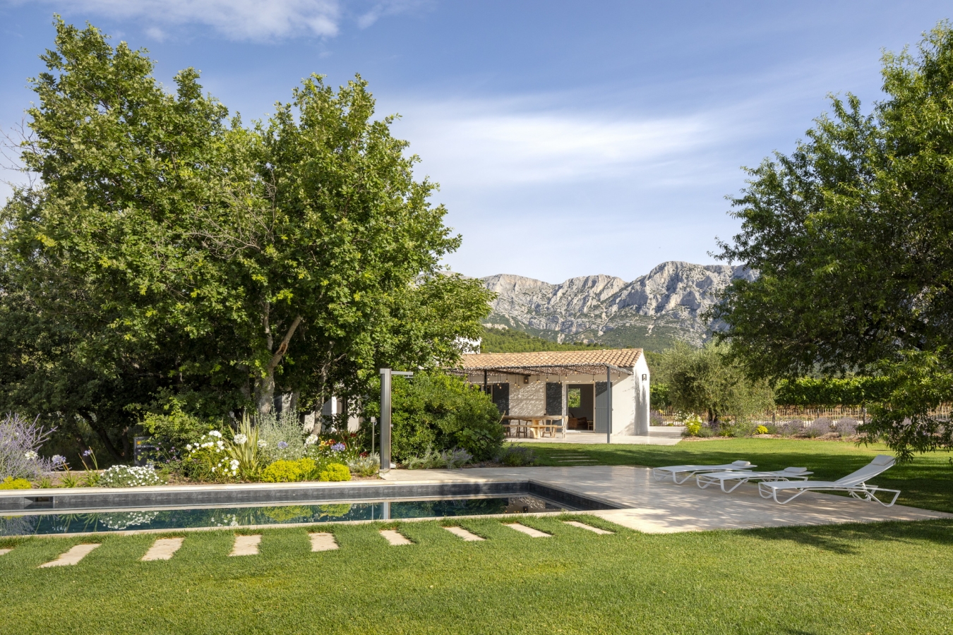 L’enjeu du projet paysager était clair : mettre en valeur le paysage exceptionnel et donner l’impression qu’il fait partie intégrante de la propriété. Les limites ont été volontairement adoucies, effacées le plus possible, pour prolonger le regard vers les vignes, les collines et la silhouette iconique de la Sainte‑Victoire.
