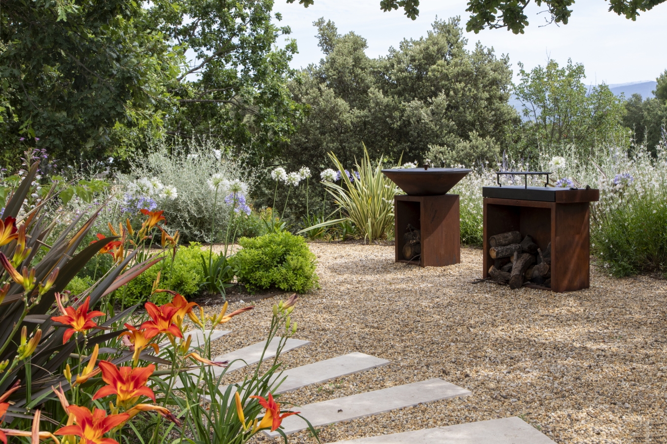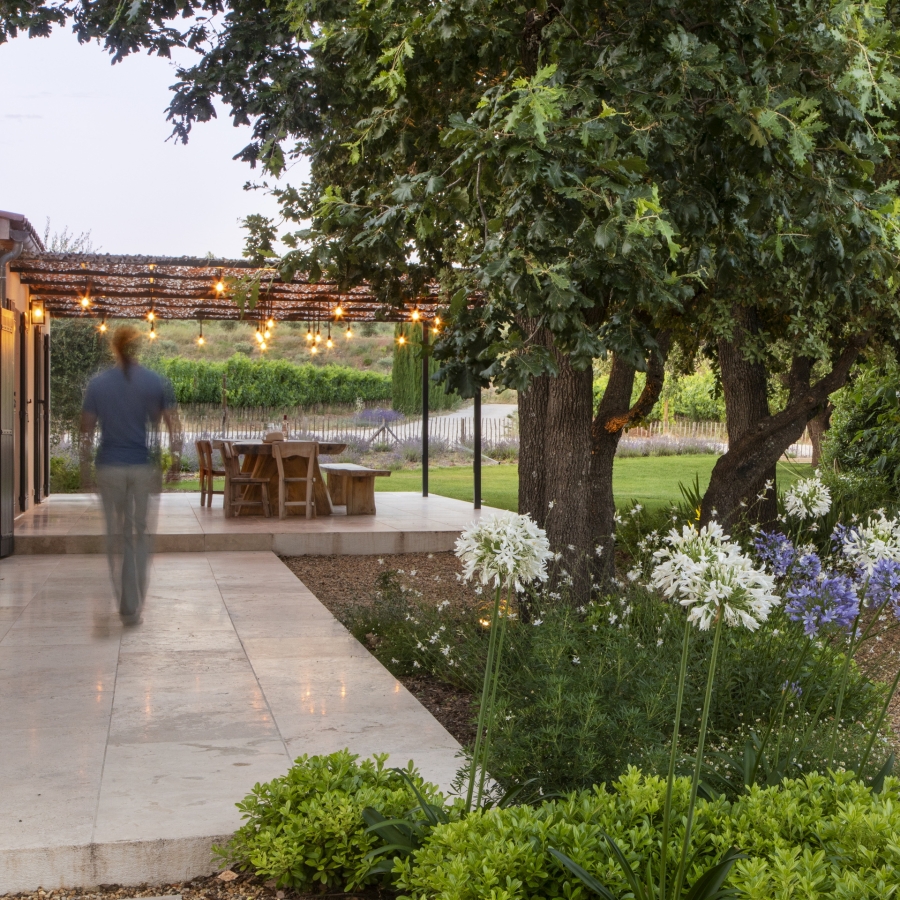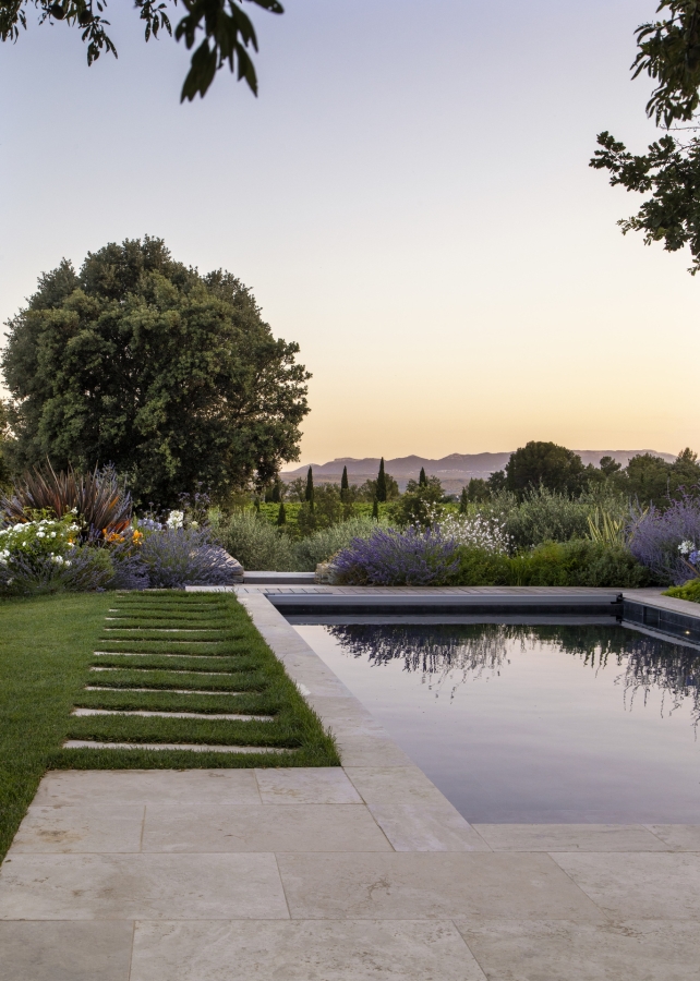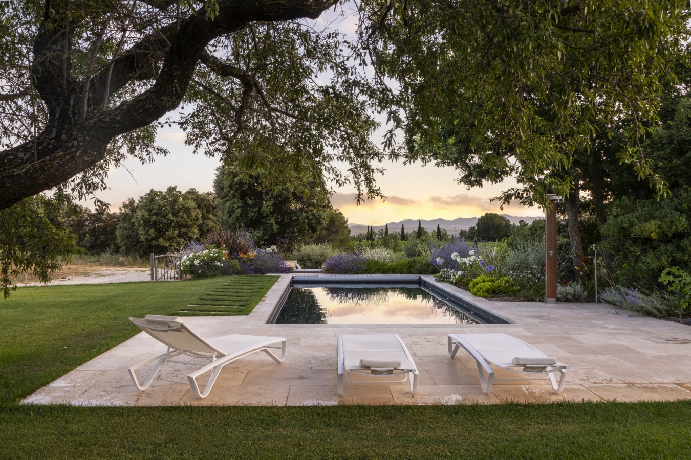 L’enjeu du projet paysager était clair : mettre en valeur le paysage exceptionnel et donner l’impression qu’il fait partie intégrante de la propriété. Les limites ont été volontairement adoucies, effacées le plus possible, pour prolonger le regard vers les vignes, les collines et la silhouette iconique de la Sainte‑Victoire.
