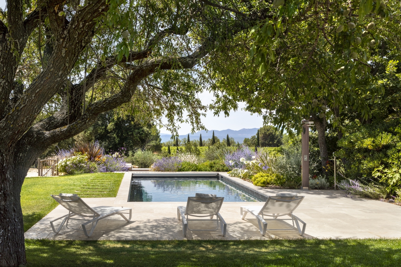 La piscine, orientée plein sud, s’installe près d’un amandier majestueux conservé. Depuis l’eau, le regard glisse vers un paysage vallonné : oliviers, cyprès et reliefs doux composent une scène apaisante.
