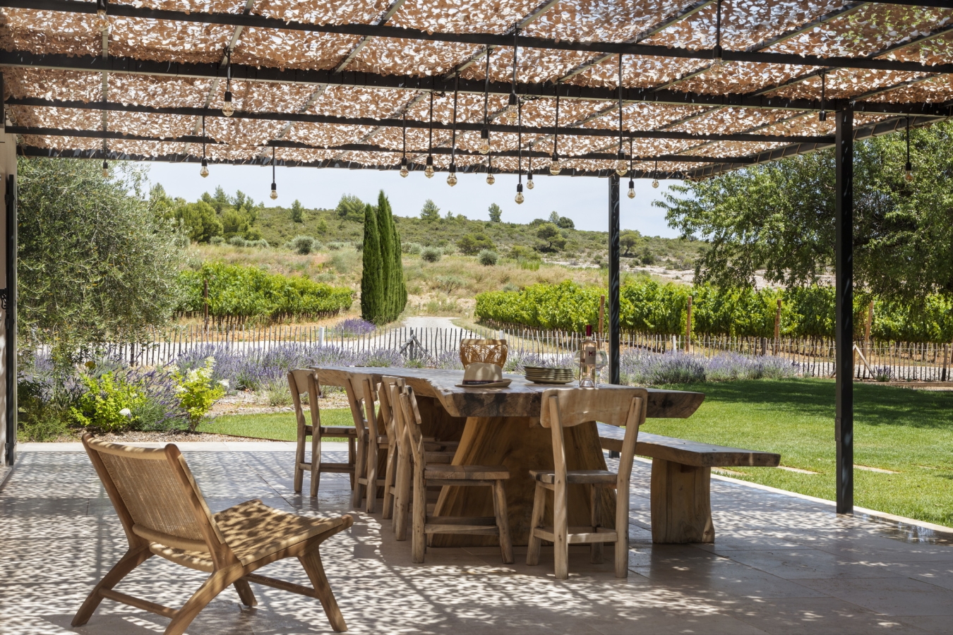 Attenante à la maison, une grande terrasse ombragée par une pergola accueille les moments de convivialité. Le mobilier en bois brut, la cuisine d’été, le brasero et la végétation généreuse créent une atmosphère chaleureuse, naturelle et authentique.