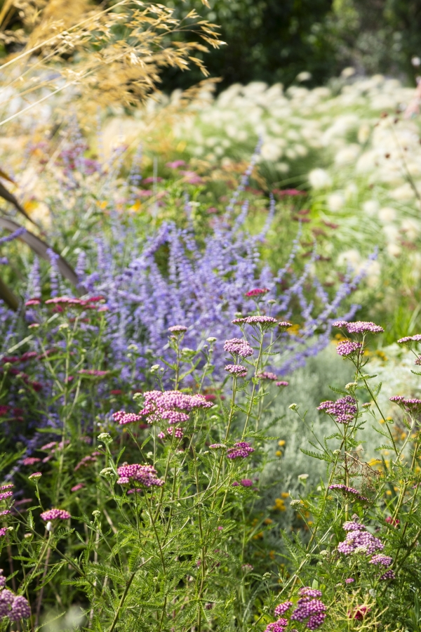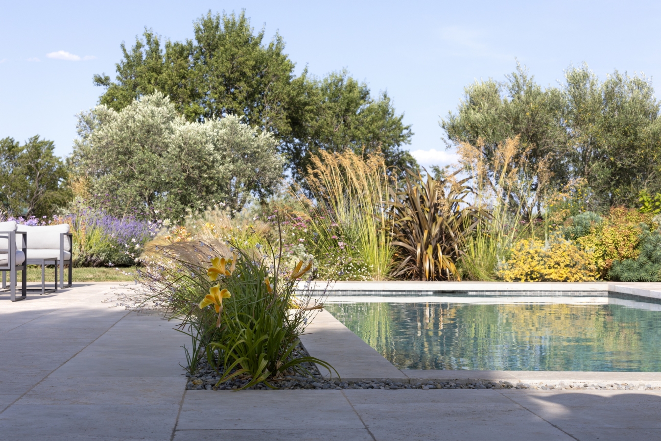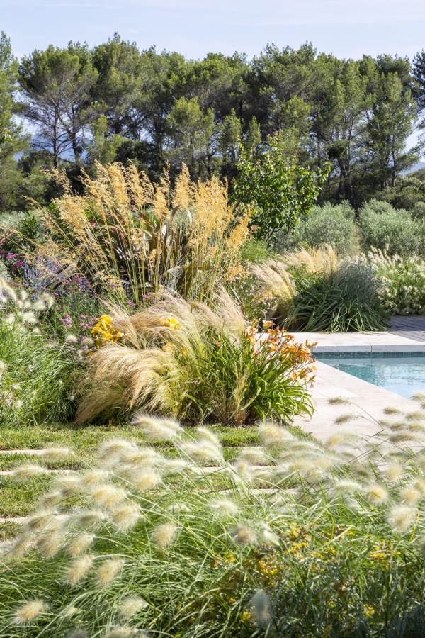 L’ensemble du projet repose sur une palette végétale exclusivement méditerranéenne, sélectionnée pour sa résistance à la sécheresse et sa capacité à évoluer naturellement au fil des saisons. Graminées élégantes, pennisetums, stipa, gauras à floraison généreuse, sedums, perovskias et autres plantes emblématiques du climat méditerranéen composent des massifs amples et libres, évoquant un paysage naturel mais jardiné.