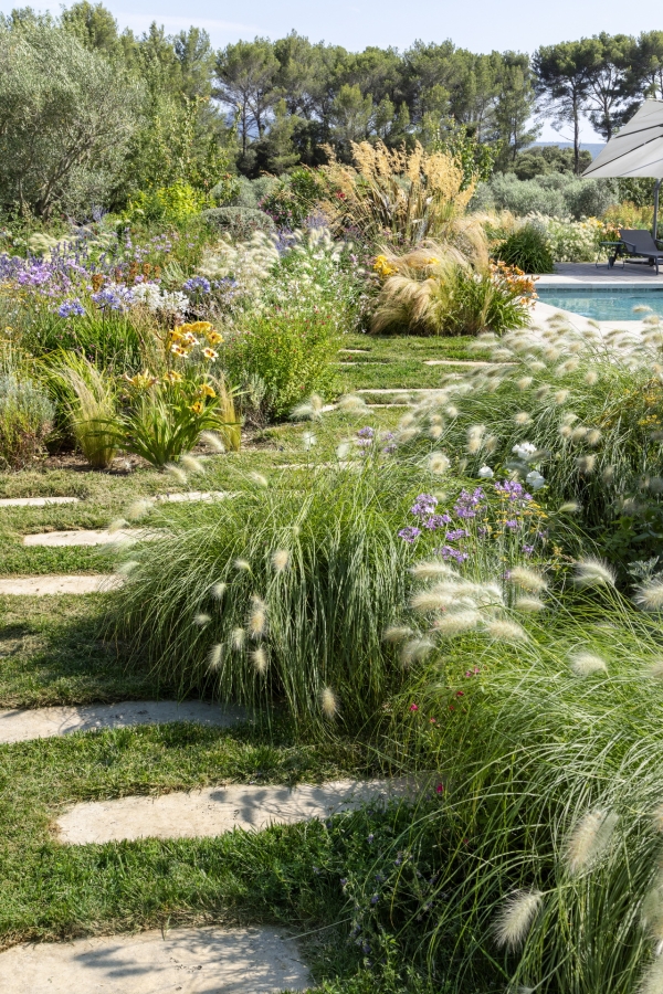 Un cheminement graphique en pas japonais, réalisé en pierre naturelle de travertin, traverse de vastes massifs naturalistes, foisonnants. Ce chemin invite à la déambulation, à la découverte progressive du jardin et de ses ambiances végétales, jusqu’à la piscine que l’on devine depuis la maison. Le jardin devient alors une expérience, un voyage, un parcours sensoriel.