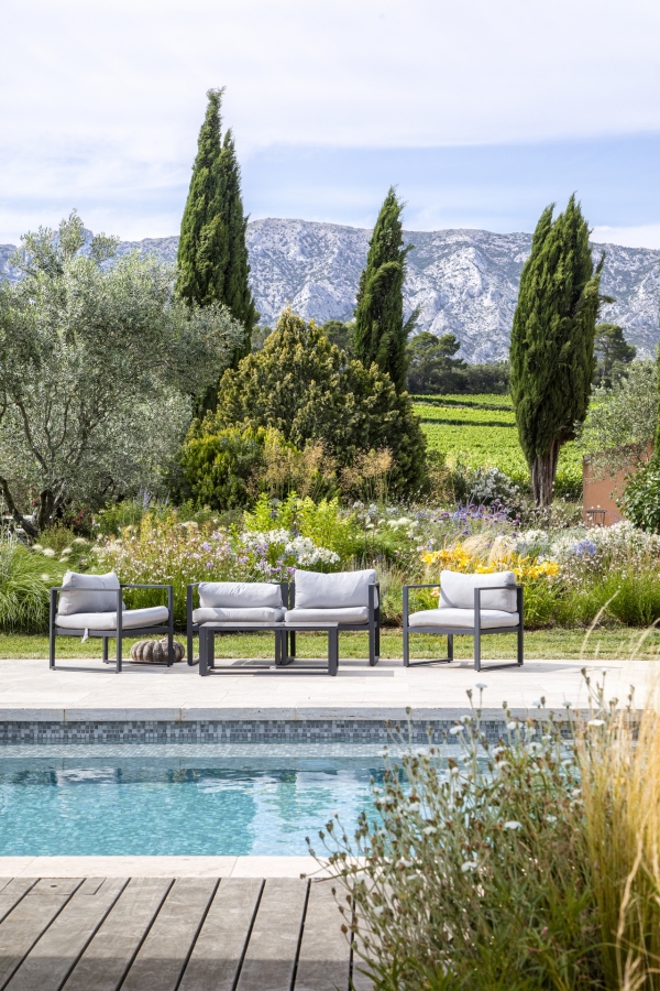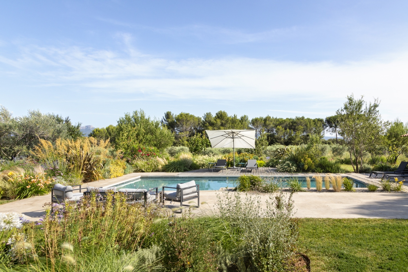 La piscine existante, autrefois isolée au milieu d’un simple espace engazonné, manquait de caractère et de lien avec la maison. Elle a été entièrement restaurée et intégrée dans une véritable scénographie paysagère. Les abords du bassin ont été repensés pour créer une continuité fluide entre la maison, le jardin et le grand paysage provençal.